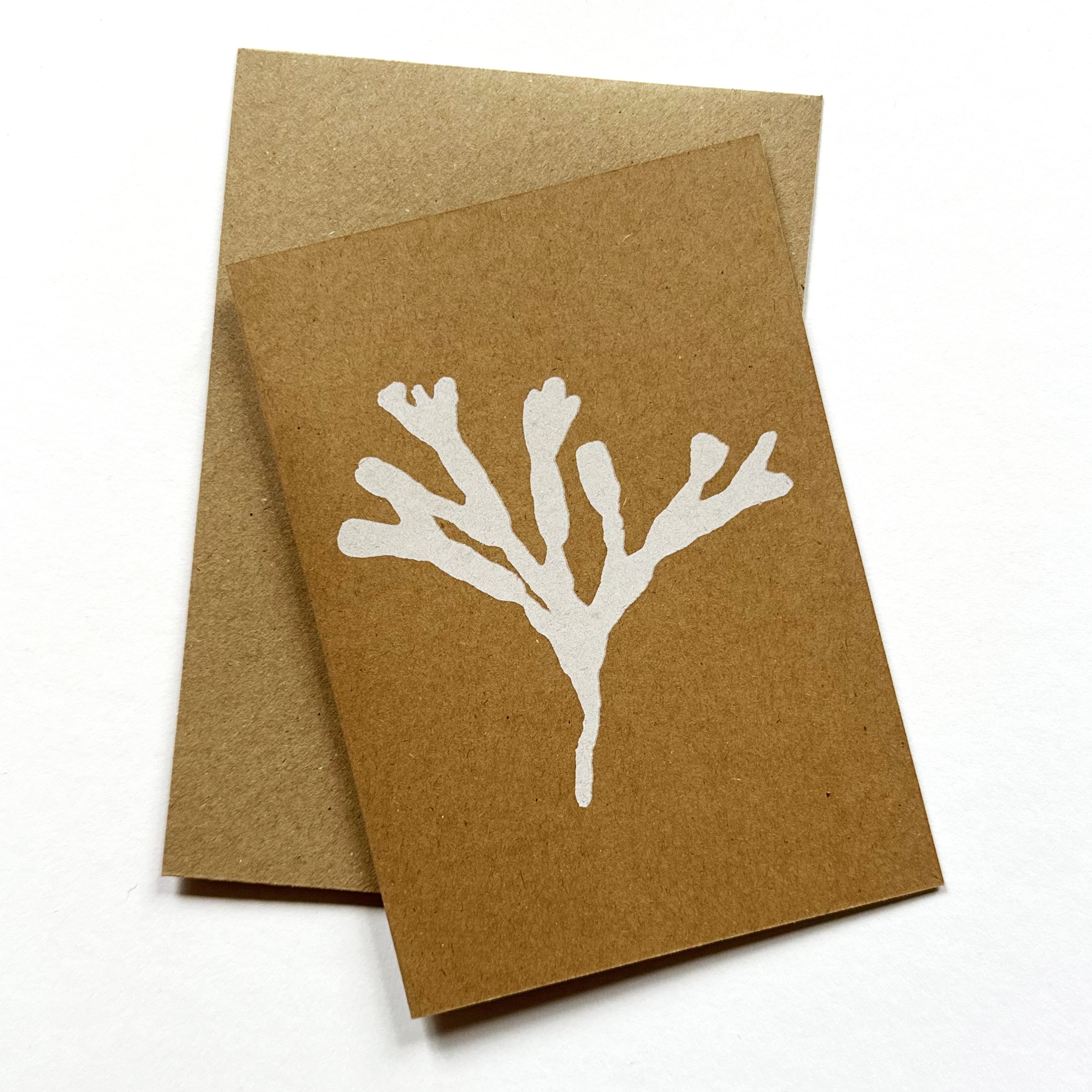 A two colour hand screen printed tree card on candy pink Colourplan GF Smith card